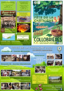 Infos les fêtes de la Châtaigne 16, 22 et  30 octobre 10h00 – 18h00  Mairie de Collobrières Place de la Libération 83 610 Collobrières Tél. : 04 94 13 83 83 Gratuit. parking obligatoire 2€, navettes gratuites.