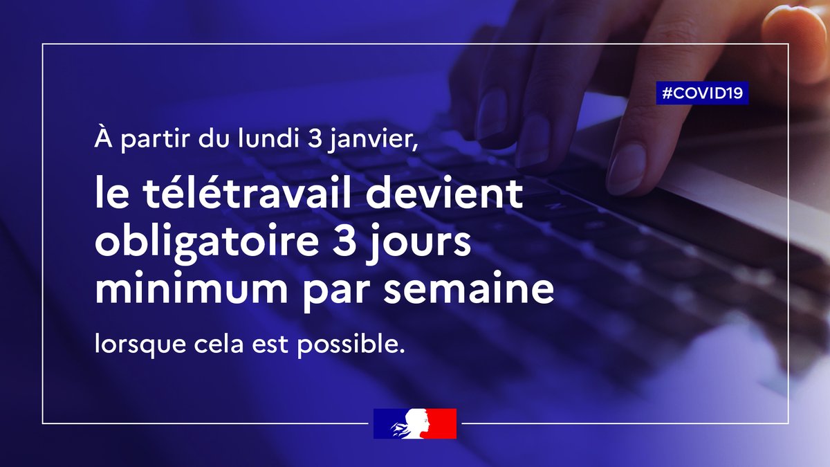 • Dès le 3 janvier, le recours au télétravail sera rendu obligatoire pour tous les salariés pour lesquels il est possible, à raison de trois jours minimum par semaine et quatre jours quand cela est possible.