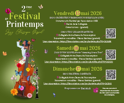 La Ville de Barjols et l’Institut Culturel « Le Jardin des Arts » ont le plaisir de vous inviter à la deuxième édition du Festival de Printemps, un événement gratuit célébrant la richesse musicale dans toute sa diversité — du classique au jazz en passant par du Gospel — du 15 au 17 mai 2026, au cœur de la Collégiale Notre-Dame de l’Assomption. Fort du succès de sa première édition, ce festival s’inscrit désormais comme un rendez-vous incontournable du territoire.
