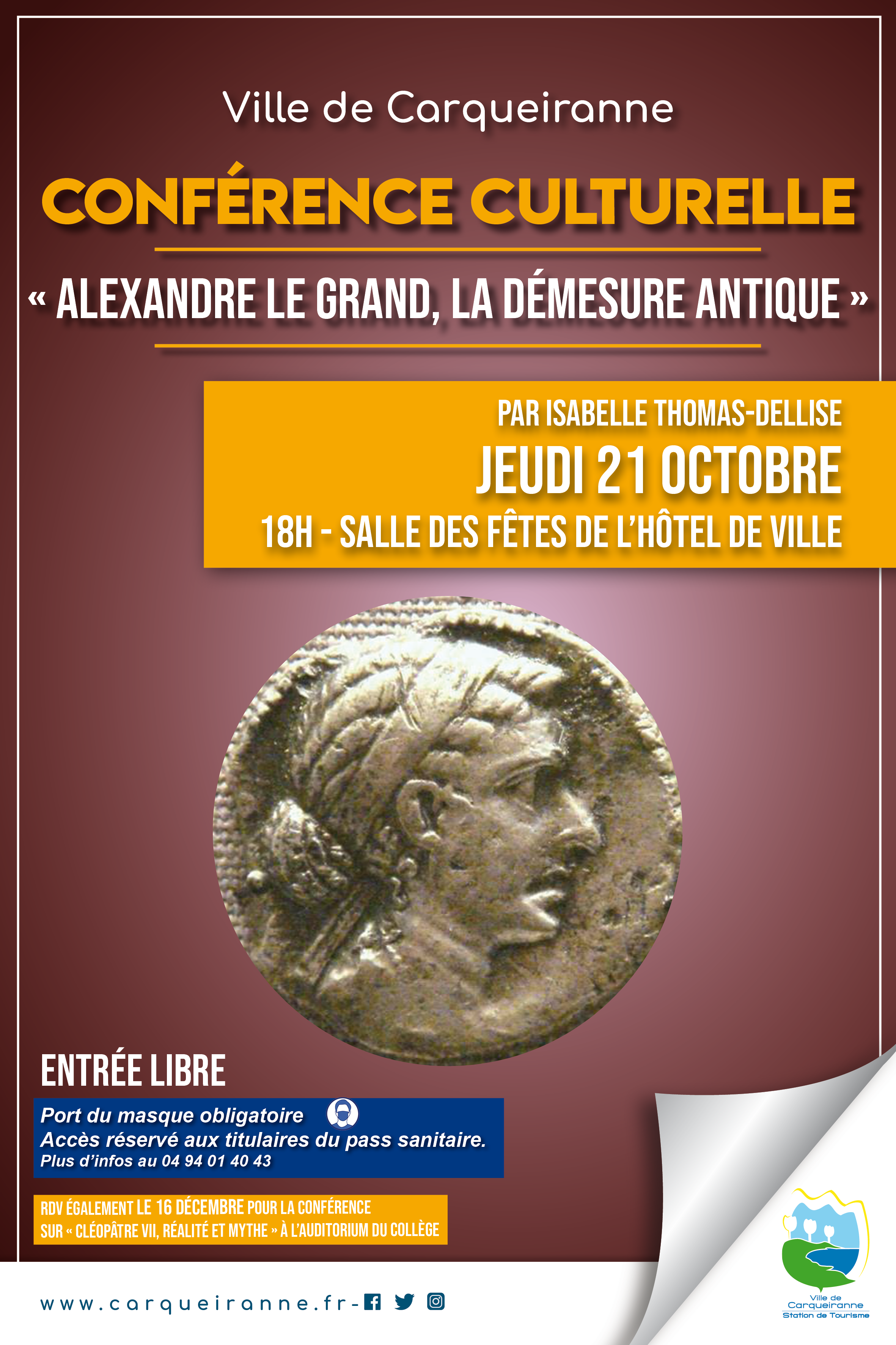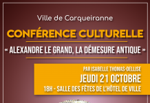 Rendez-vous jeudi 21 octobre à 18h au sein de la salle des fêtes de l’Hôtel de ville pour assister à la conférence présentée par Isabelle Thomas-Dellise ayant pour thème « Alexandre Le Grand, la démesure antique ».