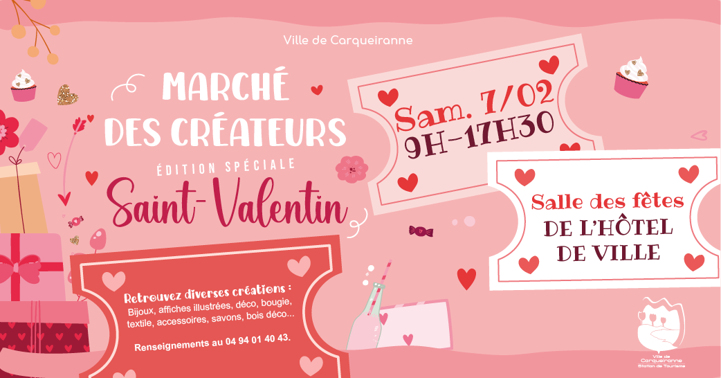 La Ville de Carqueiranne propose son marché des créateurs édition spéciale « Saint-Valentin » le samedi 7 février 2026 de 9h à 17h30 en salle des fêtes de l’Hôtel de Ville.