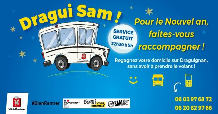Pour la Saint-Sylvestre, un service de raccompagnement à domicile sera mis en œuvre jusqu’à 5h pour ceux qui souhaitent rentrer, sur Draguignan, sans prendre le volant. Vous pouvez faire appel à ce service en composant le 06 03 97 68 72 et le 06 20 82 97 66.