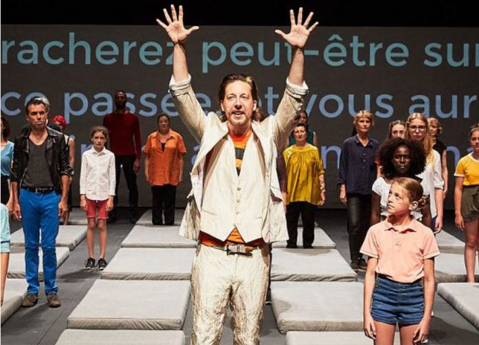 Quelle Europe désirons-nous ? Et que désirons-nous être au sein de l’Europe ? Une Europe qui puisse donner une place à tous ? Une Europe qui n’impose plus le poids de décisions qui nous échappent ? En réponse à ce questionnement, Laurent Gaudé offre un poème puissant. Un regard d’ailleurs plutôt qu’une réponse. À travers une orchestration au plateau, le compositeur et metteur en scène Roland Auzet propose de faire se rencontrer des acteurs de nationalités différentes aux côtés d’un chœur de personnes de tous les âges : un Nous. Un Nous, l’Europe. Le poème s’incarne, devient visages et paroles. Il se fait entendre et emporte dans son flux. Le drame y côtoie l’espoir ; le chant se mêle à une scansion de désirs et d’images, l’ensemble redessine la possibilité d’une histoire collective. Nous, l’Europe, Banquet des peuples, spectacle polyphonique, fait du public une assemblée de poètes-citoyens, acteurs d’un changement. Une mosaïque de langues pour une Europe plurielle, où l’art fortifie le politique, avec le vœu que celui-ci considère l’existence de chacun. A chaque soirée une personnalité est invitée à venir dialoguer avec les acteurs. Lorsque l’œuvre fut donnée  en Avignon, en 2019, c’est François Hollande qui monta sur scène défendre sa conception libérale de l’Europe.