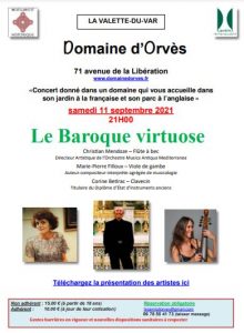 Samedi 1 septembre 21h Domaine d’Orvés Avenue de La Libération – 83160 La-Valette-du-Var Tél. 04 94 20 53 25