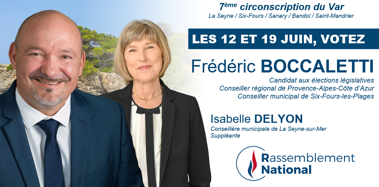 Les 12 et 19 juin, j’aurai l’honneur de porter les couleurs du Rassemblement National lors des élections législatives dans la 7ème circonscription du Var (La Seyne/Six-Fours/Sanary/Bandol et Saint-Mandrier). Ma suppléante sera Isabelle Delyon, Expert-comptable, Conseillère municipale de La Seyne.