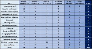Pour cette cinquième année de suivi, les 10 filets disposés sur le site de la Sauvebonne ont permis de capturer 142 oiseaux (50 contrôles et 92 baguages) à travers 4 sessions de capture. Le nombre d’oiseaux capturés était relativement stable entre toutes les sessions (respectivement 38, 35, 35 et 34 oiseaux capturés). 41% des oiseaux capturés au cours de la dernière session étaient des jeunes de l’année, alors que le premier envol avait été constaté dès le 14/05 avec deux jeunes Merles noirs. Les jeunes de l’année représentaient 8% des effectifs capturés au cours de la deuxième session et 26% des effectifs capturés au cours de la troisième.
