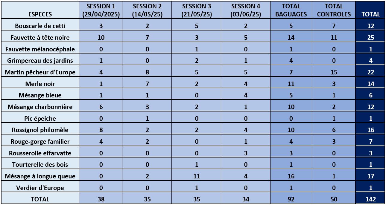 Un total de 15 espèces a pu être recensé lors des 4 sessions de baguage, pour un total de 142 individus. La diversité spécifique diminue par rapport aux quatre dernières années (respectivement avec 20, 21, 20 et 19 espèces capturées respectivement en 2021, 2022, 2023 et 2024). Les effectifs repartent cependant à la hausse (107 individus en 2021, 102 en 2022, 131 en 2023 et 127 en 2024). Cette année, la Fauvette à tête noire (25), le Martin-pêcheur d’Europe (22), la Mésange à longue queue (17) sont les trois espèces les plus représentées, suivies par le Rossignol philomèle (16), le Merle noir (14) et la Bouscarle de Cetti et la Mésange charbonnière (12). Le site, très diversifié en terme de paysages (ripisylves, prairies, zones buissonneuses, roselières, saulaies) reste très favorable à l’avifaune. D’autres espèces telles que le Grimpereau des jardins (4), la Mésange bleu (4) et le Rougegorge familier (7), ont été régulièrement capturées dans les filets. Certaines espèces présentes sur le site mais dont la capture via les filets est inhabituelle ont également pu être recensées comme la Tourterelle des bois (1) ou le Pic épeiche (1).