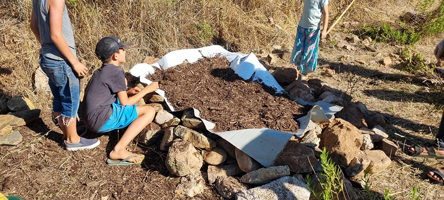 Certains éléments du chantier du 10 et 11 juillet ont été réutilisés : enrochements, rondins de bois, bois morts. En complément, la Ville d’Hyères a apporté du compost. Des tuiles et du sable ont également été apportés par les bénévoles. Une bâche a été mise en place pour retenir le sable, substrat favorable pour accueillir les pontes. Les différents éléments (tuiles, rochers, bois) ont été déposés en couches successives.