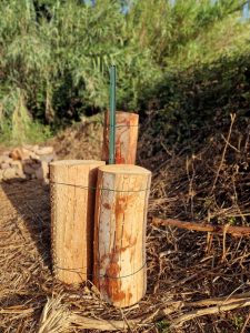 Pour les hyménoptères sauvages, des troncs ont été récupérés, des trous de différents diamètres ont été percés afin de permettre à différentes espèces de s’y loger pour hiverner ou s’y reproduire. Les troncs ont été regroupés ensemble, bien exposés au soleil.