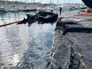 Vers 05h20, le yacht était intégralement détruit par l’incendie, au trois quart coulé par environ 3 mètres de fond. Vers 08h20, le feu était par ailleurs maîtrisé sur le drone sous-marin, sans risque d’extension supplémentaire. En particulier, les batteries du drone n’ont pas été affectées.