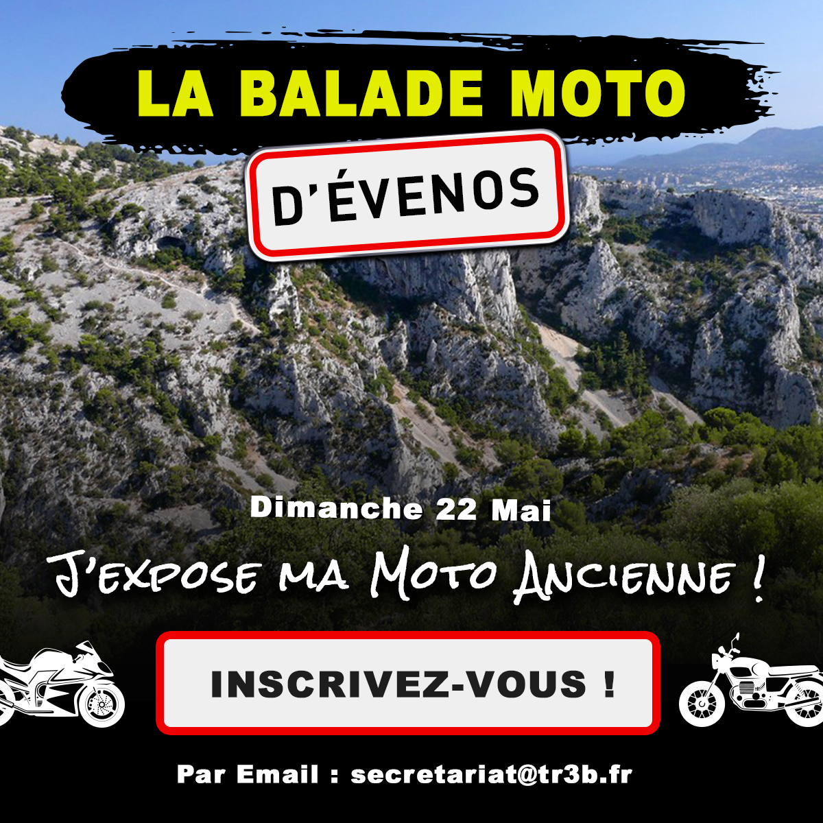 L’évènement sera rythmé par de nombreuses étapes toute la journée : balade moto avec un petit parcours crée à cette occasion, exposition de motos anciennes et concours des motos, démonstrations de trial, marché de créateurs du Var « Évenos Expose », championnat de tourisme et bien d’autres surprises.Tout le monde (avec motos) peut participer à la balade, pour cela il suffit d’envoyer sa candidature à l’adresse mail suivante : secretariat@tr3b.fr (avant le Vendredi 20 Mai), il sera demandé 10 euros de frais de participation/moto.