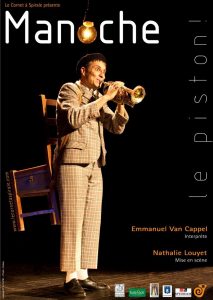 Manoche, enfant croisé de Bourvil et de Raymond Devos, nous entraîne dans une désopilante et poétique virée musicale. Tendre clown accroché à son instrument, Manoche jongle subtilement avec les mots qui se jouent de lui et l’entraînent dans des situations rocambolesques, tout en tentant de nous faire découvrir les mystères du cornet à pistons. Un prétexte pour dresser un tableau de notre société avec des histoires à dormir debout.