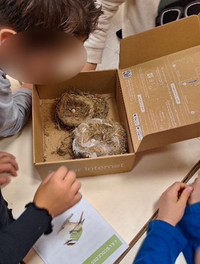 La journée s’est déroulée en deux temps. Le matin, les enfants ont eu droit à une animation d’une heure en classe, pour aborder les caractéristiques des oiseaux, le rôle de leurs plumes, leur morphologie et leur cycle de vie. Ils ont même pu toucher des plumes et voir plusieurs nids de mésanges avec des œufs non éclos, récupérés lors d’un nettoyage de nichoirs par les bénévoles de l’association.