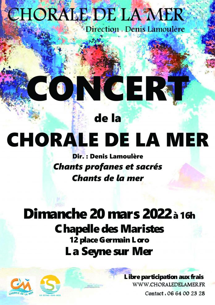 Premier concert de La Chorale de la Mer en la Chapelle des Maristes, 12 place Loro, sous la direction de Denis Lamoulère, dimanche 20 mars à 16 heures