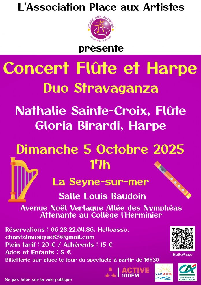 L’Association culturelle PLACE AUX ARTISTES est heureuse de vous convier à un moment musical d’exception avec le Duo Stravaganza, composé de Nathalie Sainte-Croix à la flûte traversière et Gloria Birardi à la harpe.