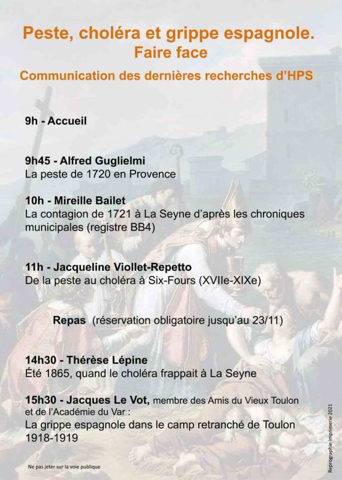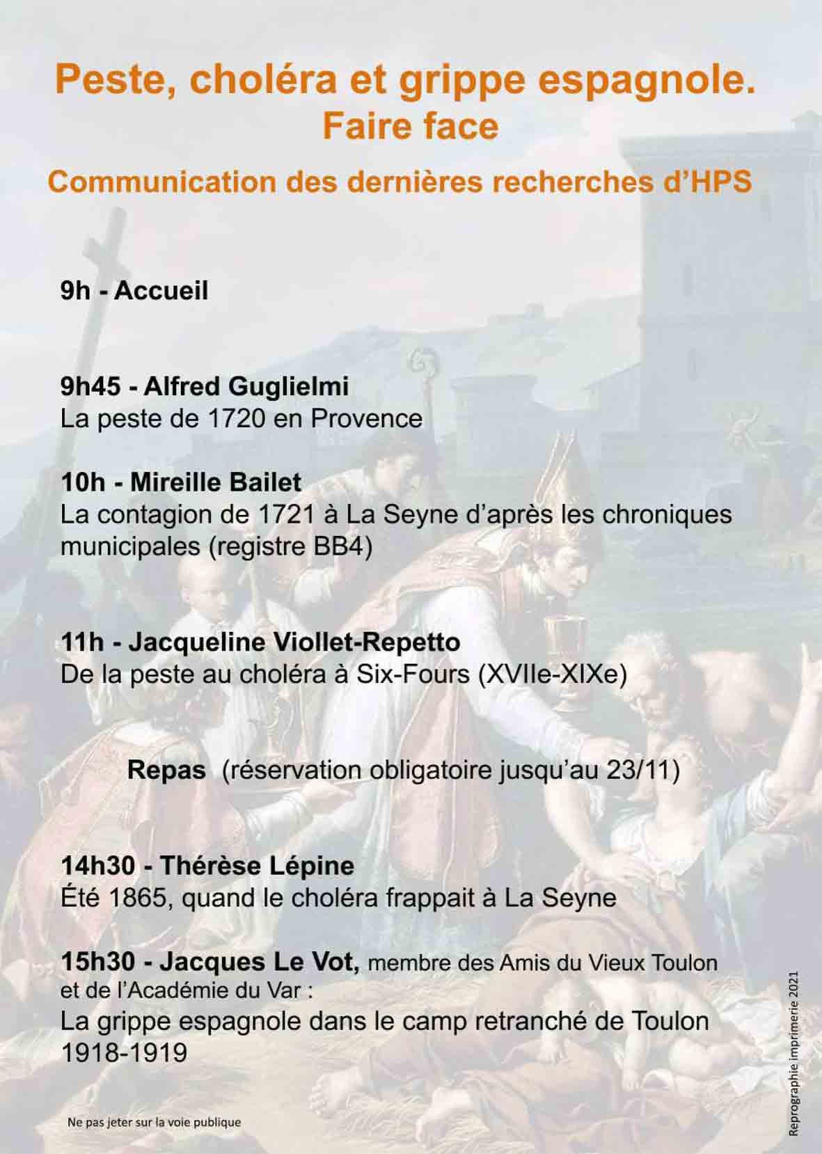 L’association Histoire et patrimoine seynois organise, samedi 27 novembre à partir de 9 heures, avec le soutien de la Ville son 21e colloque sur le thème « Peste, choléra et grippe espagnole. Faire face » Salle Baudouin, au collège L’Herminier, avenue Verlaque.