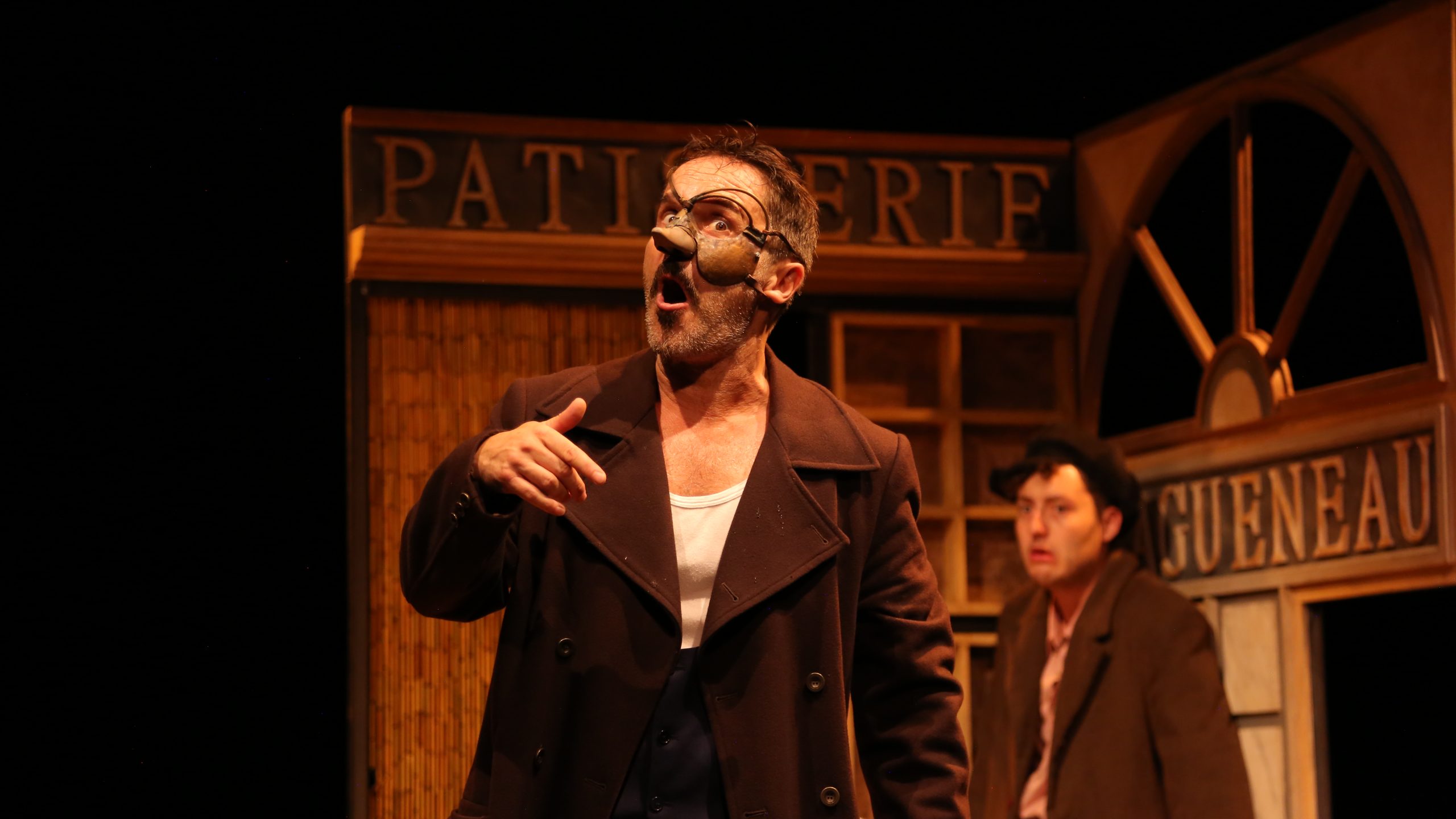 S’éloignant de l’image attendue du mousquetaire, notre Cyrano devient un acteur – réalisateur qui transforme sa vie en film des années 1920. Il est masqué comme le sont ces « gueules cassées » dont on a reconstitué le visage en bronze ou céramique. Héro blessé, il est l’artiste romantique qui ira jusqu’au bout de son histoire, séquence après séquence, jusqu’au « clap »de fin.