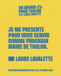 «Je veux restaurer la confiance, rétablir la sécurité, redynamiser les quartiers oubliés, poursuivre le développement et préparer l’avenir. Je me présente pour servir comme prochain maire de Toulon.»… «Après le départ de Monsieur Falco, notre ville doit écrire une nouvelle page de son histoire, estime dans sa lettre adressée aux Toulonnaises et aux Toulonnais Laure Lavalette. Si son travail a permis de nombreuses avancées pour Toulon, sa succession ouvre de nombreux défis et bien des sujets restent en suspens.»