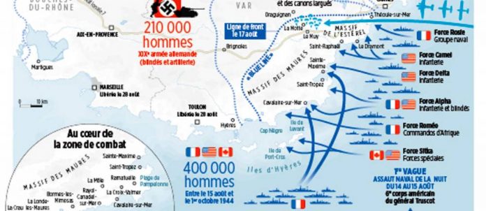 Le 15 août 1944, soixante-dix jours après Overlord en Normandie, l’opération Dragoon est déclenchée en Provence. Trois divisions américaines venant de Naples débarquent ainsi entre Cavalaire et Saint-Raphaël. Elles sont suivies par quatre divisions françaises parties de Corse, de Tarente et d’Oran, qui s’emparent de haute lutte de Toulon et de Marseille.