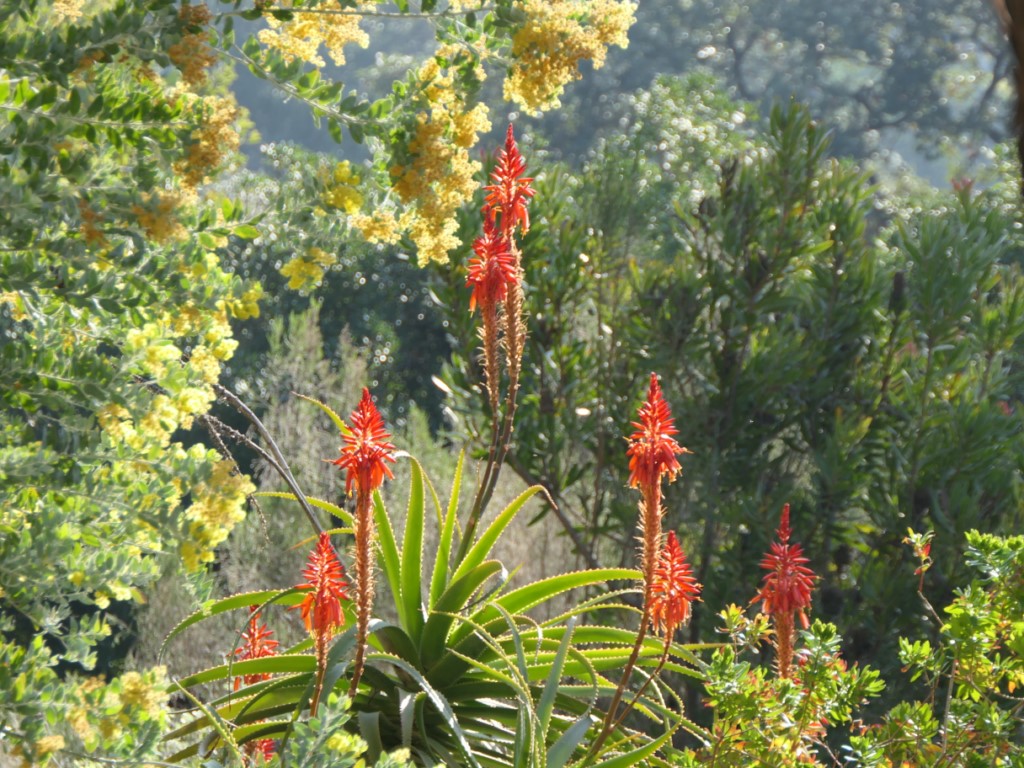 En Australie, les différentes espèces du bosquet de mimosas échelonnent leur floraison de décembre à mars. En Afrique du Sud, les Aloès sont en pleine floraison, entourés de tapis d’astéracées bleues : les Felicia, et plus bas, de petites asters orange, les Dimorphoteca sinuata.