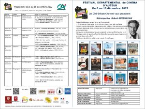 Du mardi 6 au vendredi 16 décembre « Les Ciné-débats citoyens » vous proposent le 2ème Festival Départemental de Cinéma d’Auteur consacré à l’ensemble des œuvres cinématographiques du réalisateur, producteur et scénariste Robert GHEDIGUIAN.