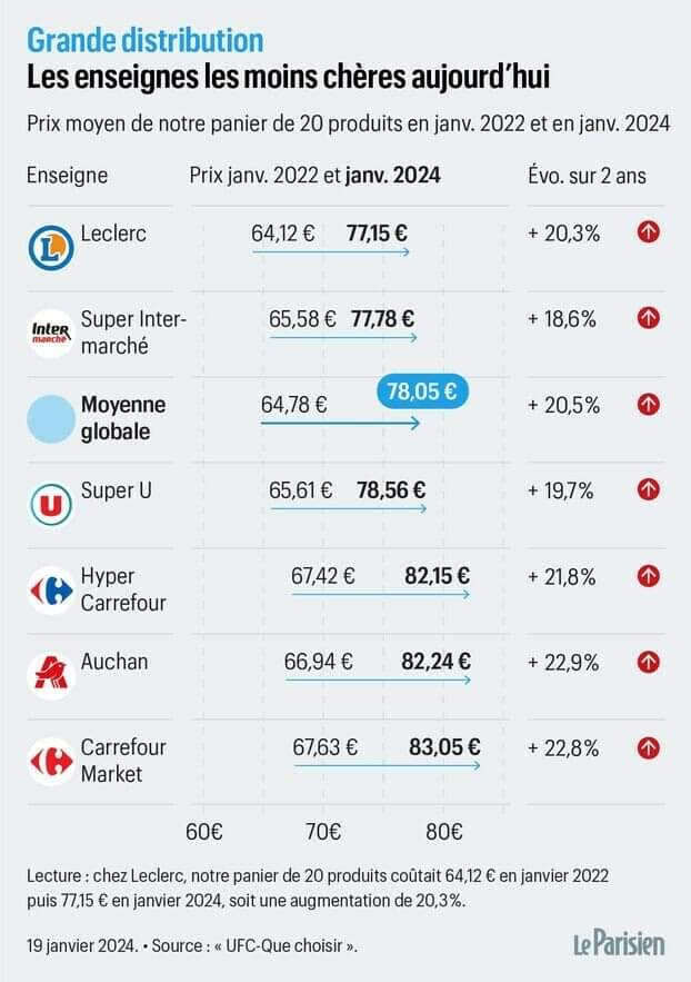 Mais entre le 22 janvier et 24 janvier 2024, nous avons vu notre ticket de caisse flamber : PLUS 20%, selon l’Insee.