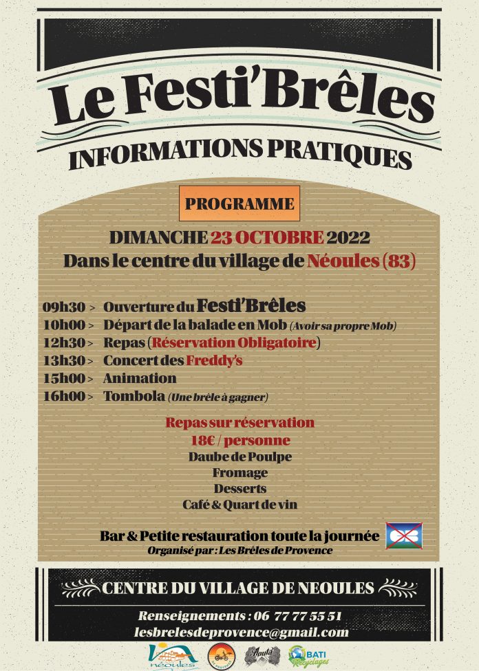 Le dimanche 23 Octobre 2022 se tiendra à Néoules au centre du village, la première édition du Festi’Brêles, le premier rassemblement des Brêles de Provence.