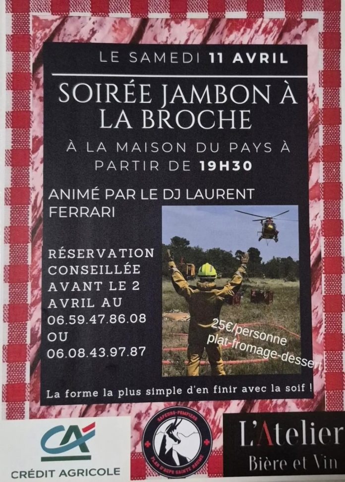 Sainte-Baume Mont-AurélienPlan-d'Aups-Sainte-BaumeSociétéVar Plan d’Aups Sainte Baume : Soirée jambon à la broche By TV83.info - Avr 10, 2026 0 Facebook Twitter Google+ Pinterest WhatsApp Un repas jambon à la broche convivial pour le plat suivi du fromage et d’un dessert. La soirée est animée par le DJ Laurent FERRARI. Samedi 11 avril 2026 à partir de 19h30. Maison de Pays Tarif unique : 25 €. portable : 06 59 47 86 08