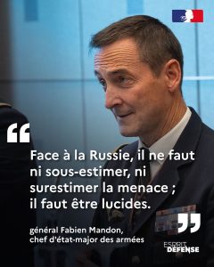 En même temps, le général MANDON, Chef d’état-major de l’Armée française, déclare devoir « préparer les Armées et la population à un « choc » pour « changer d’échelle » et de « renforcer les forces morales du pays ». « En vivant depuis si longtemps en paix, nous avons du mal à prendre pleinement conscience des dangers qui nous entourent ». Face à ces dangers il poursuit son travail de préparation des esprits : « Il faudra être prêts, déterminés et crédibles pour opposer de la résistance »