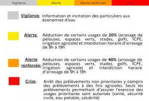 En fonction de l’évolution de la situation, le préfet pourra arrêter des mesures de restriction et de limitation des usages de l’eau, par grands bassins-versants, en application de l’arrêté-cadre sécheresse.