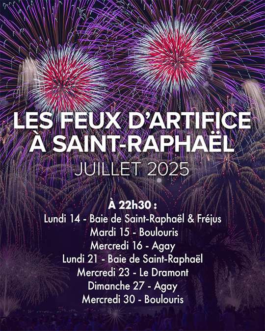 Lundi 14 juillet – traditionnel feu d’artifice de la Fête nationale (cérémonie, concert, grande fête), dans la baie de Saint-Raphaël et Fréjus, mené conjointement avec la Ville de Fréjus