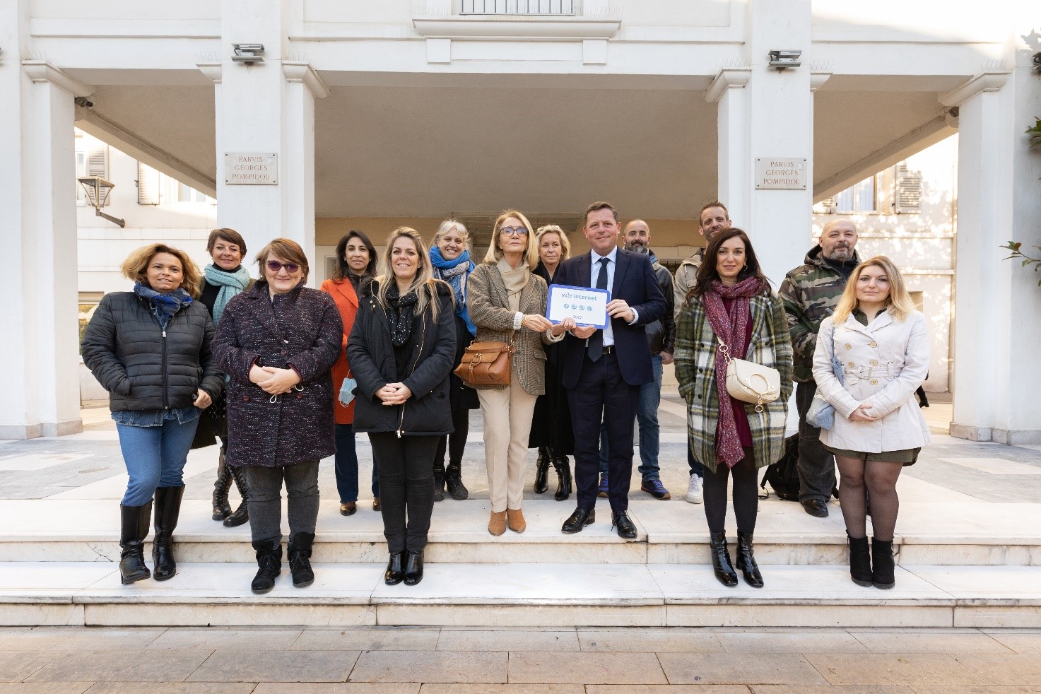 légende de la photo : « Frédéric Masquelier, Maire de Saint-Raphaël, accompagné de Mme Françoise Meyer, conseillère municipale en charge du numérique et de l’informatique et des agents municipaux qui ont contribué à l’élaboration du dossier de labellisation Ville internet. »