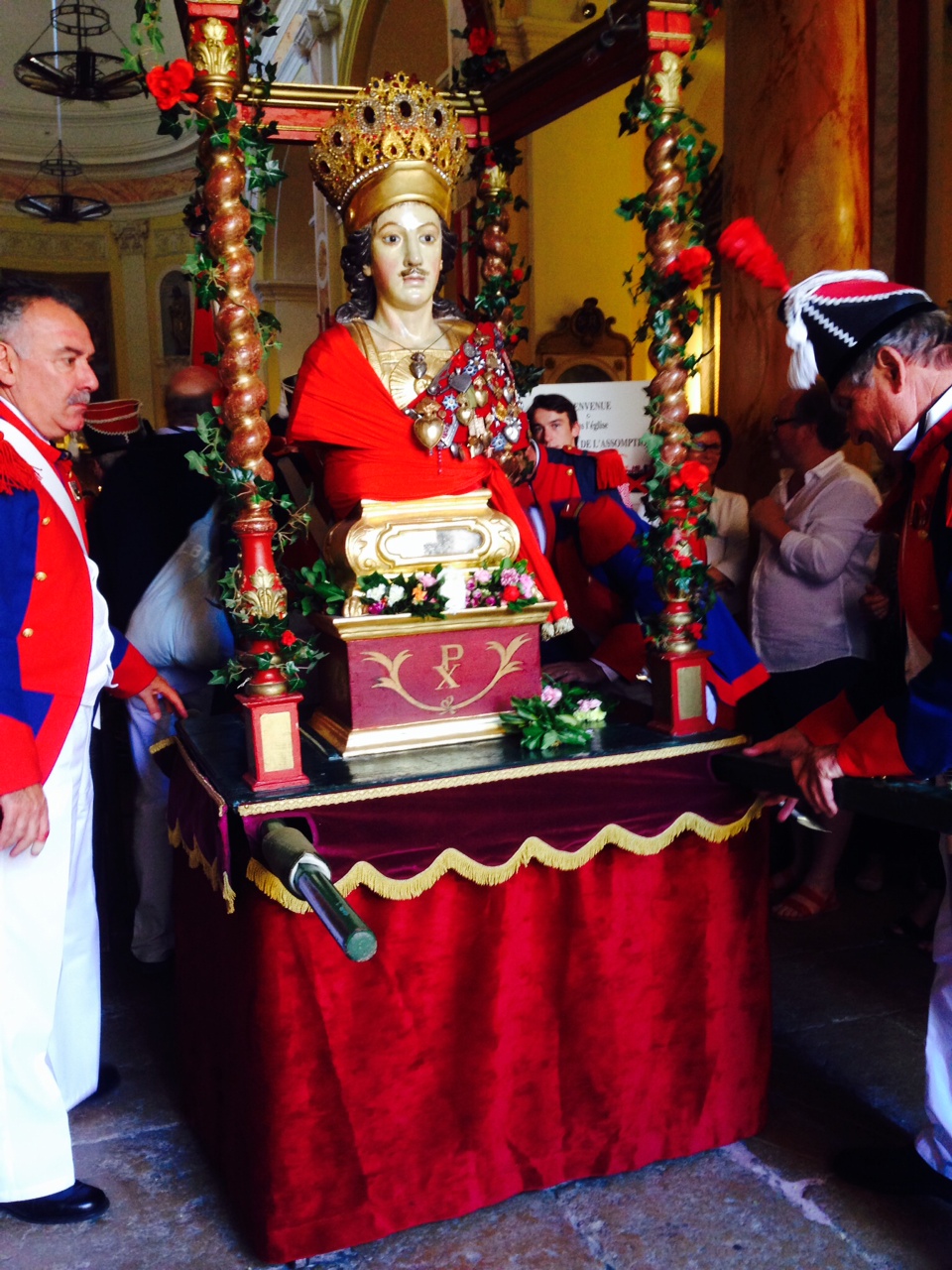 Elle fut emportée par les courants jusqu’aux rives de Saint-Tropez. À la fin du XVe siècle, la ville de Saint-Tropez est reconstruite, fortifiée et repeuplée. Le rôle des nouveaux habitants de Saint-Tropez était de défendre la ville et ses environs. Ils portaient également leurs armes pour célébrer la fête du Saint, qui avait lieu le 17 mai dans la chapelle Saint-Tropez, située « hors les murs ». La tradition d’honorer le Saint par les armes s’est perpétuée jusqu’à nos jours après la suppression de ces privilèges.