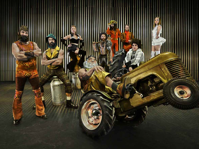 La compagnie québécoise est de retour avec sa quatrième production, fondée comme ses précédents spectacles sur les vieilles traditions de son pays, bousculées par le monde contemporain. Après les bûcherons, les foires et l’héritage religieux, voici donc… la ferme. Et quelle ferme Sur fond de funk -voire punk- endiablé, mâtiné de chanson trad’, le tout interprété avec un accent délicieux par trois musiciens, une exploitation agricole prend vie. Les six artistes-fermiers entament leur journée de travail, sous la houlette du patriarche Alain Carabinier, car le cirque Alfonse est une grande famille. Ils ont fort à faire et enchaînent les numéros acrobatiques, maniant le seau à grain et le pneu de tracteur aussi aisément que la fourche ou la brouette. Les animaux dansent en rythme, les cloches de vache taille XXL volent dans les air, tandis que la fille de ferme est en équilibre sur ses pots à lait et que ses comparses jonglent avec des œufs crus sur une planche instable. Au Canada, l’esprit western n’est pas loin : clou du spectacle, un taureau mécanique fait des siennes, prêt à envoyer valser l’audacieux qui l’enfourchera. Arrimez bien votre Stetson et vos Santiags, gare au rodéo !