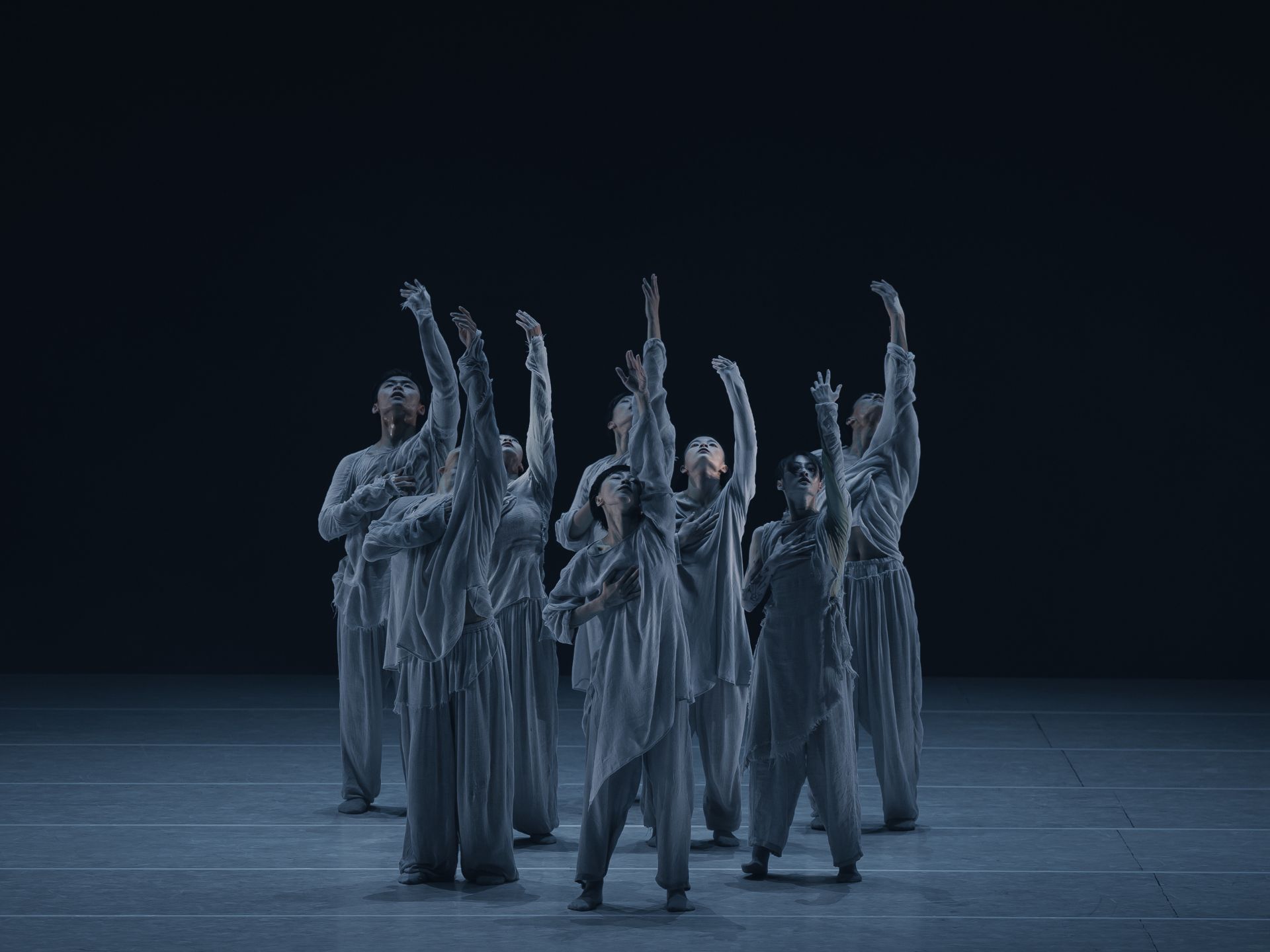 La pièce s’inspire de la calligraphie chinoise, particulièrement d’un idéogramme signifiant « humain », pour développer un ruban sinueux de mouvements ondulatoires, de portés, de sauts, de micro-oscillations. Pour évoquer la rencontre entre deux êtres, l’amour, la connexion, le départ aussi de ceux qui nous manquent. Des sentiments universels qui donnent naissance à « une qualité abstraite du mouvement » dans laquelle XieXin excelle. Surgis de l’ombre, les interprètes apparaissent et disparaissent telles des figures fantasmatiques, le corps sculpté par les effets de lumière, s’éloignent ou se rejoignent, en duos ou en groupes, à l’unisson ou disloqués. La partition, millimétrée et d’une extrême simplicité – en apparence seulement – explore une multitude de gestuelles qui les conduit de la lenteur à l’explosion jusqu’à l’état de grâce