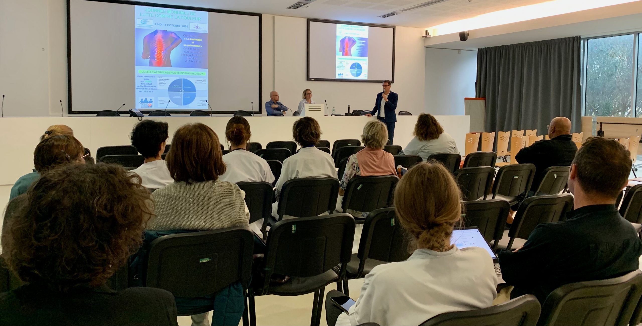 La conférence s’est déroulée en présence de M Yann Le Bras directeur du CHITS, docteur Kamel Mechtouf, chef de service de rhumatologie, docteur Stéphanie Fassie médecin algologue et présidente du Comité de lutte contre la douleur