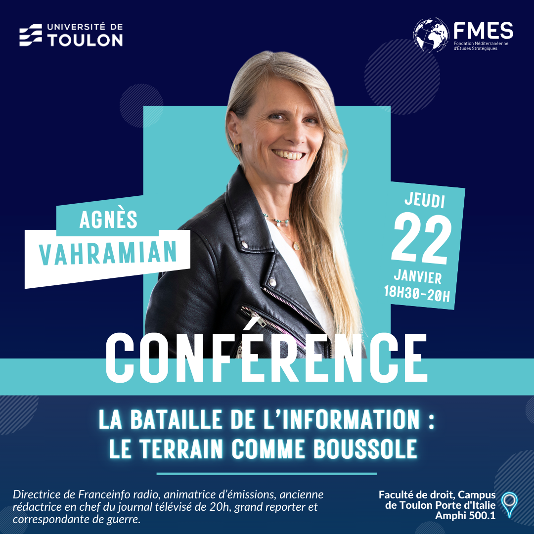 L’Institut FMES a l’honneur de vous inviter le jeudi 22 janvier de 18h30 à 20h, à la conférence de son cycle 2026 qui accueillera Agnès Vahramian sur la thématique « La bataille de l’information: le terrain comme boussole ».