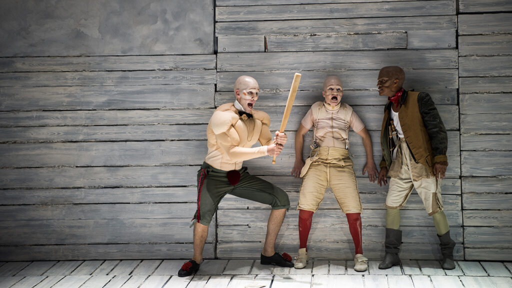 Au milieu d’un décor étroit, les scènes se succèdent dans une mécanique folle. Derrière leurs étonnants masques, les comédien·nes tournent en ridicule les « spécialistes ». Toutes et tous jouent avec les anachronismes, faisant résonner cette pièce avec notre actualité.