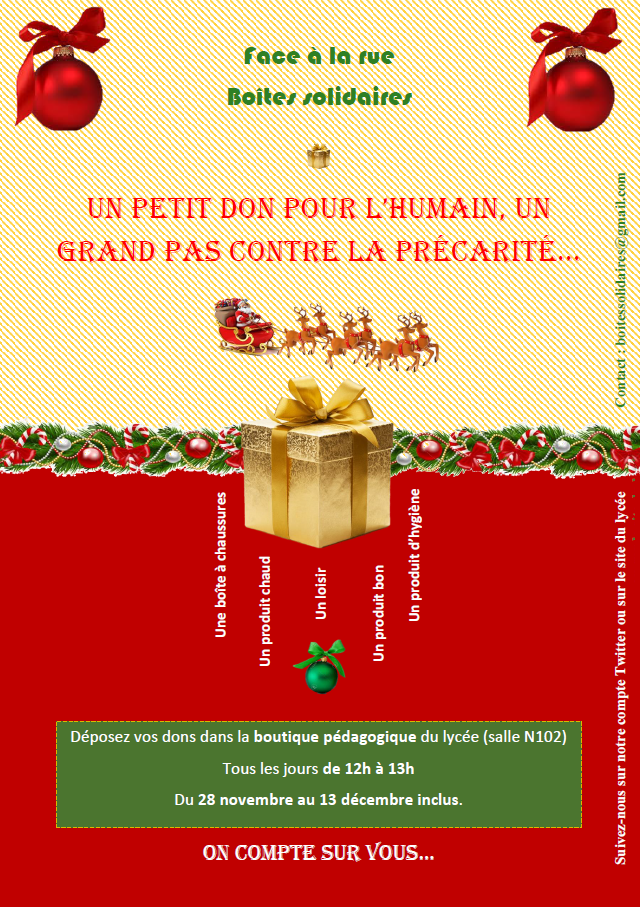 La classe de Terminale MCVA1 (Métiers du Commerce et de la Vente) du Lycée Professionnel Parc Saint Jean à Toulon organise une opération solidaire qui va permettre d’aider les plus démunis. Pour cela, votre aide nous est nécessaire et nous en appelons à votre générosité.