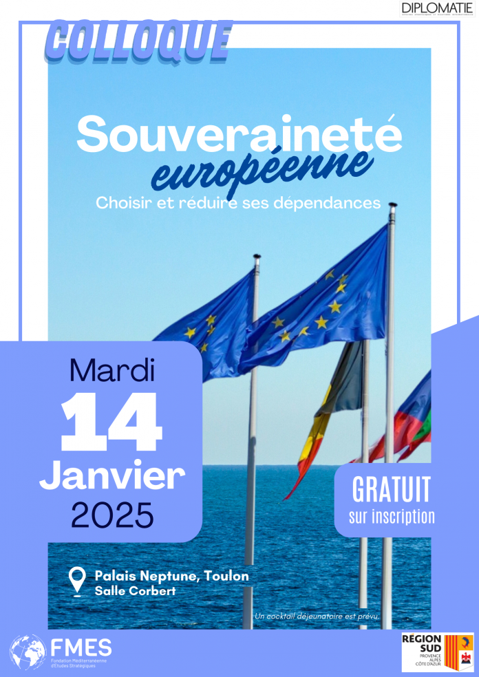 L’institut FMES est ravi de vous convier au colloque intitulé « Souveraineté européenne : choisir et réduire ses dépendances ». Celui-ci aura lieu le mardi 14 janvier 2025, au Palais des Congrès Neptune de Toulon.