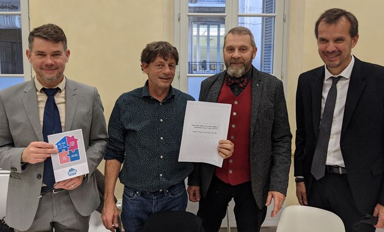 Signature de la convention constitutive du GCSMS Un Chez-Soi d’Abord Toulon TPM : de gauche à droite : Jean Marc BARGIER (Directeur du Centre Hospitalier Henri Guérin) ; Jean-Claude GRECO (Directeur général d’ISATIS) ; Philippe GUINET (Président d’OVA) ; Bertrand PAVILLON (directeur-adjoint, représentant Monsieur Yann LE BRAS Directeur du Centre Hospitalier Intercommunal de Toulon La Seyne-sur-mer)