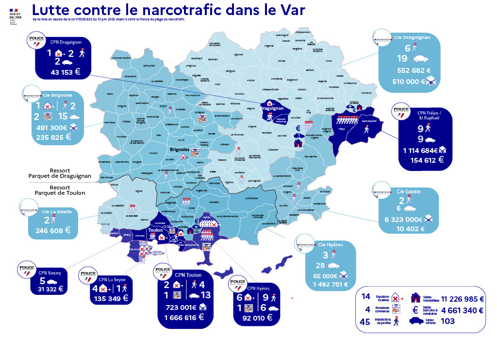 L’action des FSI et des douanes est complétée par les mesures administratives prises par la préfecture. En effet, depuis la promulgation de la loi du 13 juin 2025 visant à sortie la France du piège du narcotrafic, le Préfet du Var a pris :