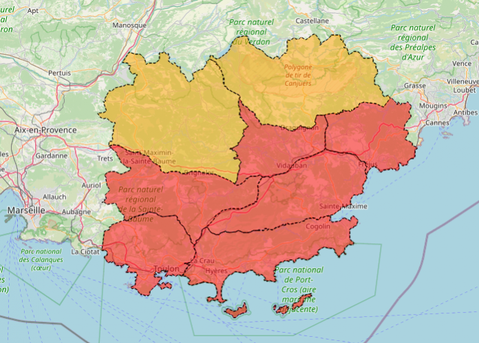 Mardi 8 juillet 2025, les massifs des Monts Toulonnais, de la Sainte Baume, de la Corniche des Maures, des Maures, du Centre Var, l’Estérel et des Îles d’Hyères (en rouge sur la carte) sont fermés pour risque très sévère d’incendie. Accès, circulation et présence interdites.