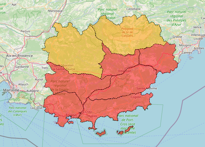 Le massif du Haut Var et du plateau de Canjuers (en orange sur la carte) sont en risque sévère d’incendie. Leur accès est déconseillé et les travaux interdits exceptés les travaux agricoles, sylvicoles ou présentant un caractère d’intérêt général de 5h à 13h. Ces travaux doivent obligatoirement s’accompagner d’un dispositif d’extinction.