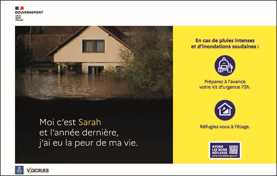 Pour la sécurité de tous, il est indispensable que chacun s’approprie les bons réflexes qui sauvent en cas pluies intenses. La campagne de communication 2024 qui est déployée depuis la fin du mois d’août jusqu’au 30 novembre, s’appuie sur des messages simples et pragmatiques pour rappeler les bons comportements à adopter en cas de survenance de ces phénomènes.