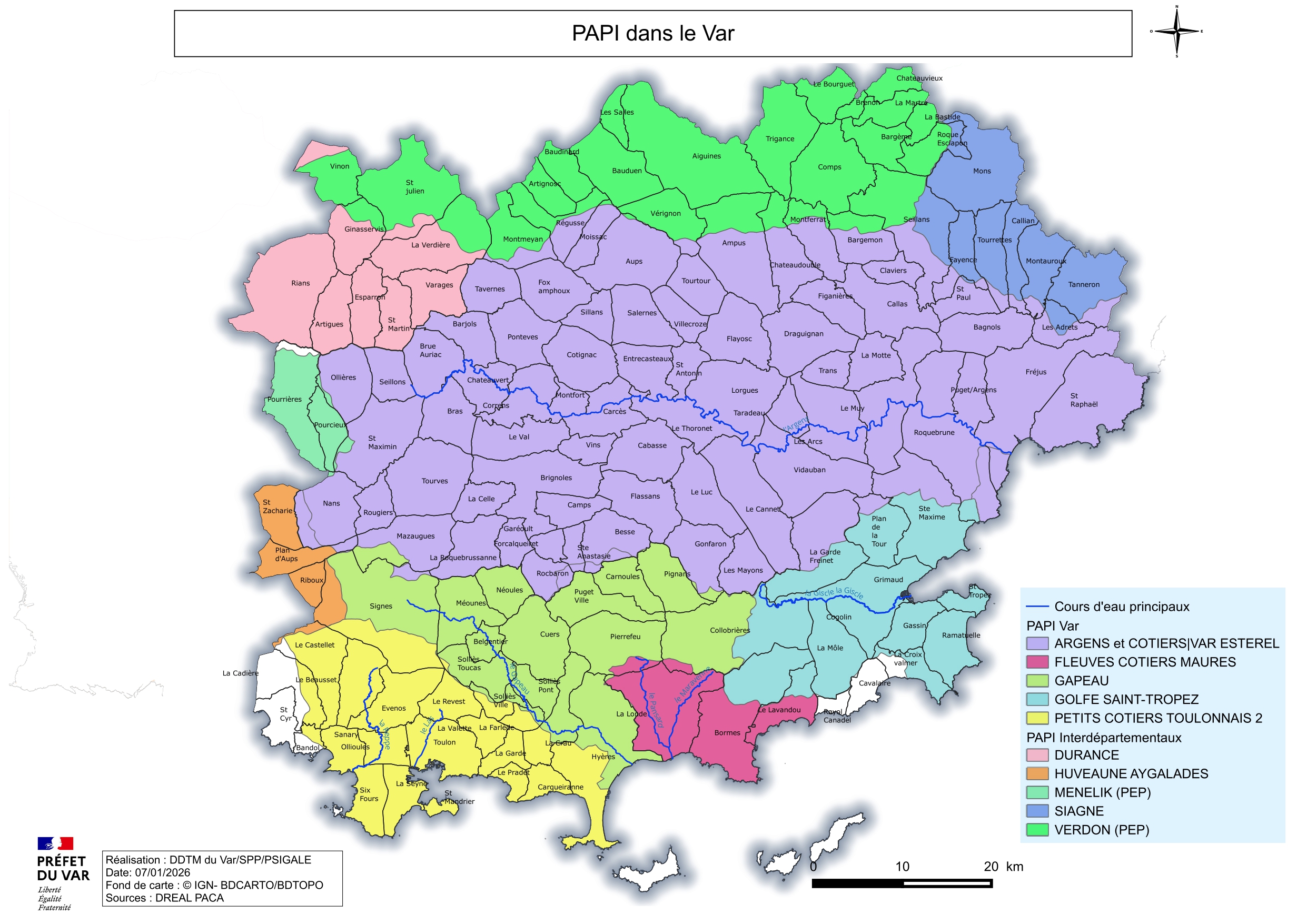 Le département du Var compte cinq programmes d’actions de prévention des inondations portés par les collectivités (cf la carte jointe en annexe), dont le coût total des actions s’élève à 244,7 M€. L’État soutient financièrement ces actions à hauteur de 104 M€ (93 M€ de fonds Barnier et 11 M€ de fonds vert) soit 42,8 % du budget total ; leur réalisation s’étend jusqu’en 2032.