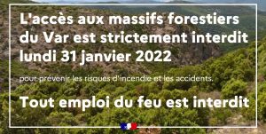 Pour prévenir les risques d’incendie (au vu de l’absence de pluie depuis plusieurs semaines) et les accidents (chutes de branches ou d’arbres) un arrêté préfectoral interdit la pénétration, la circulation et le stationnement dans les massifs forestiers du département du Var le lundi 31 janvier 2022.