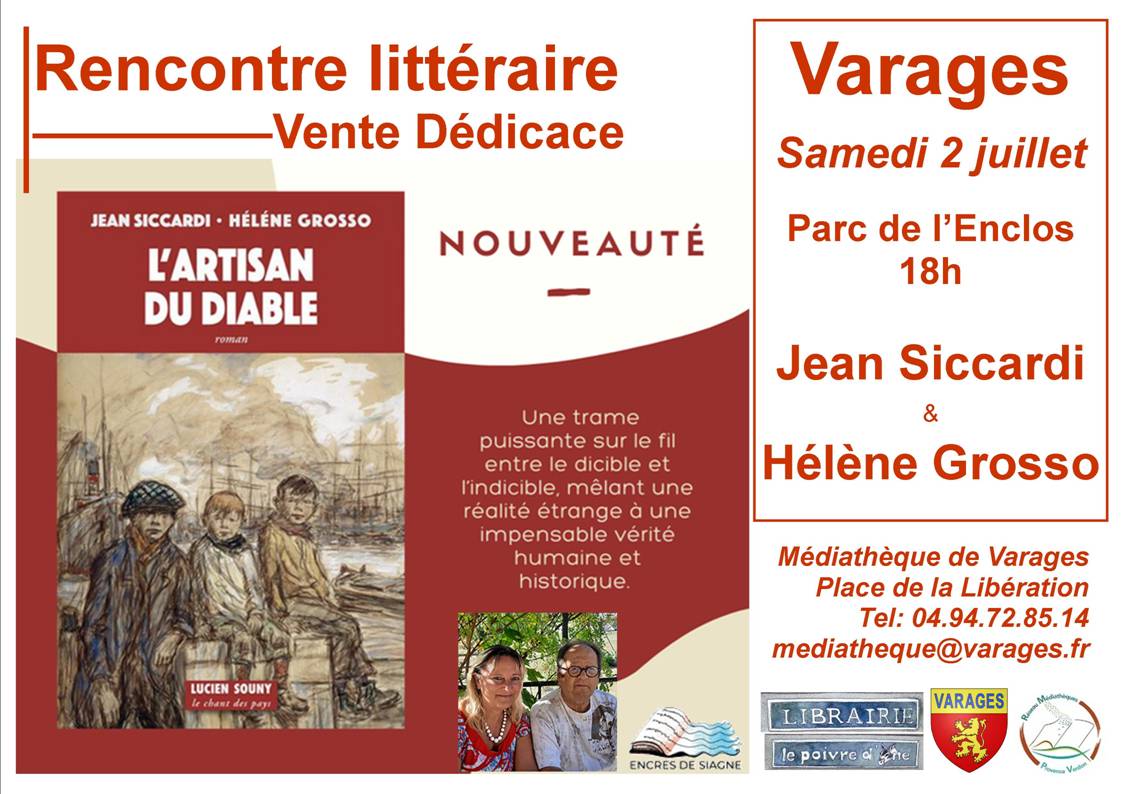 La médiathèque de Varages a le plaisir d’accueillir Jean Siccardi et Hélène Grosso pour une rencontre littéraire et dédicace pour leur roman « L’artisan du diable ».