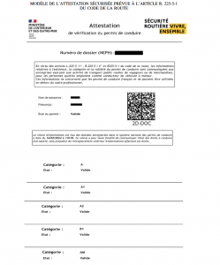 Les données de l’attestation sont issues du Système national des permis de conduire (SNPC). Les informations communiquées ne concernent que les permis de conduire français. Ils ne peuvent pas être utilisées en dehors du cadre professionnel.